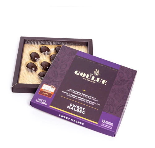 1 Caja de Chocolate Semiamargo Belga 55% relleno con Malbec Dulce (60 g) 12 Bombones.